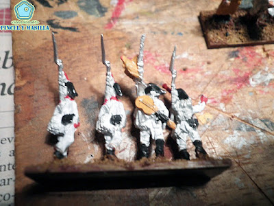 Después es pintar a toda la tropa con el color carne (siempre de abajo a arriba, como si lo fuésemos vistiendo), con el blanco de los uniformes y, por último, con el negro de los sombreros, botas y cartucheras.